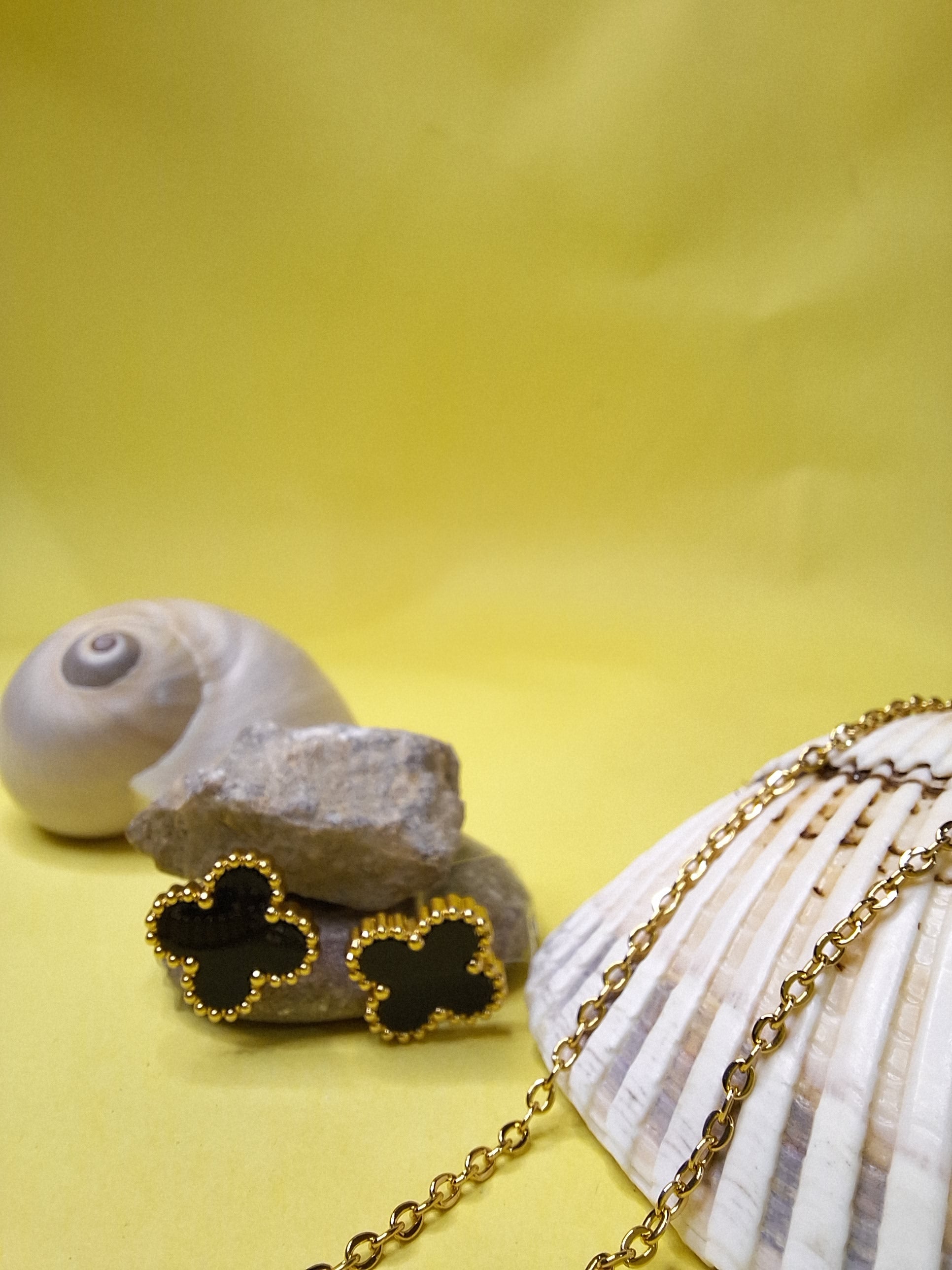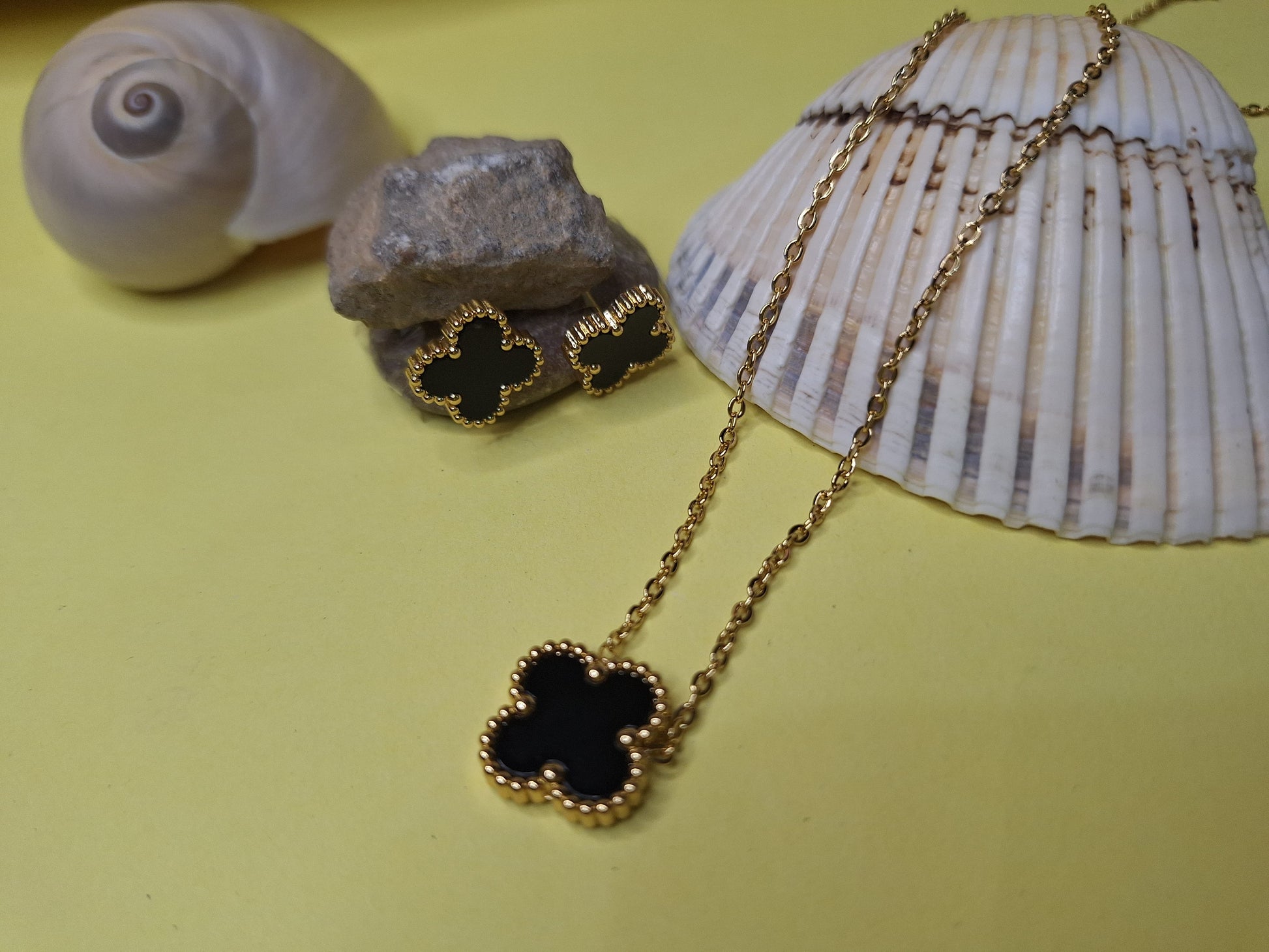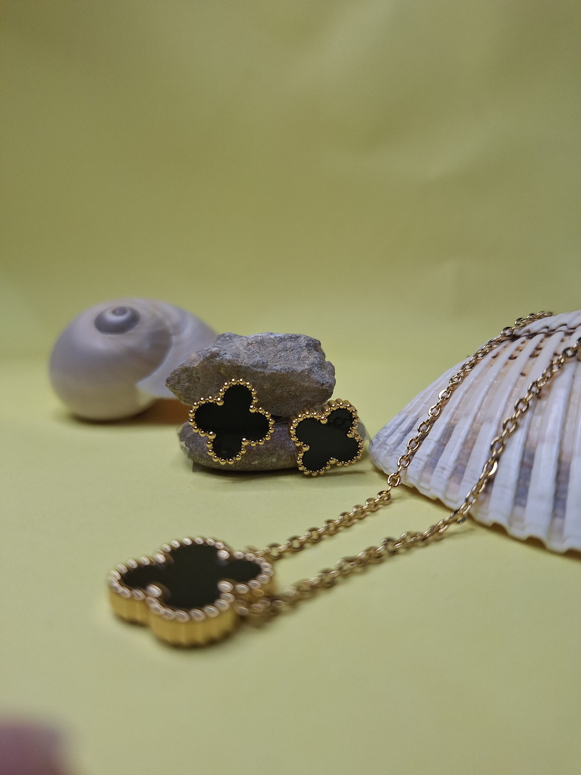 The rich black polish on stainless steel ensures durability, while its glossy finish keeps your look effortlessly chic from day to night. Ideal for both casual and formal wear, this set adds a touch of refined modern charm to every outfit.
