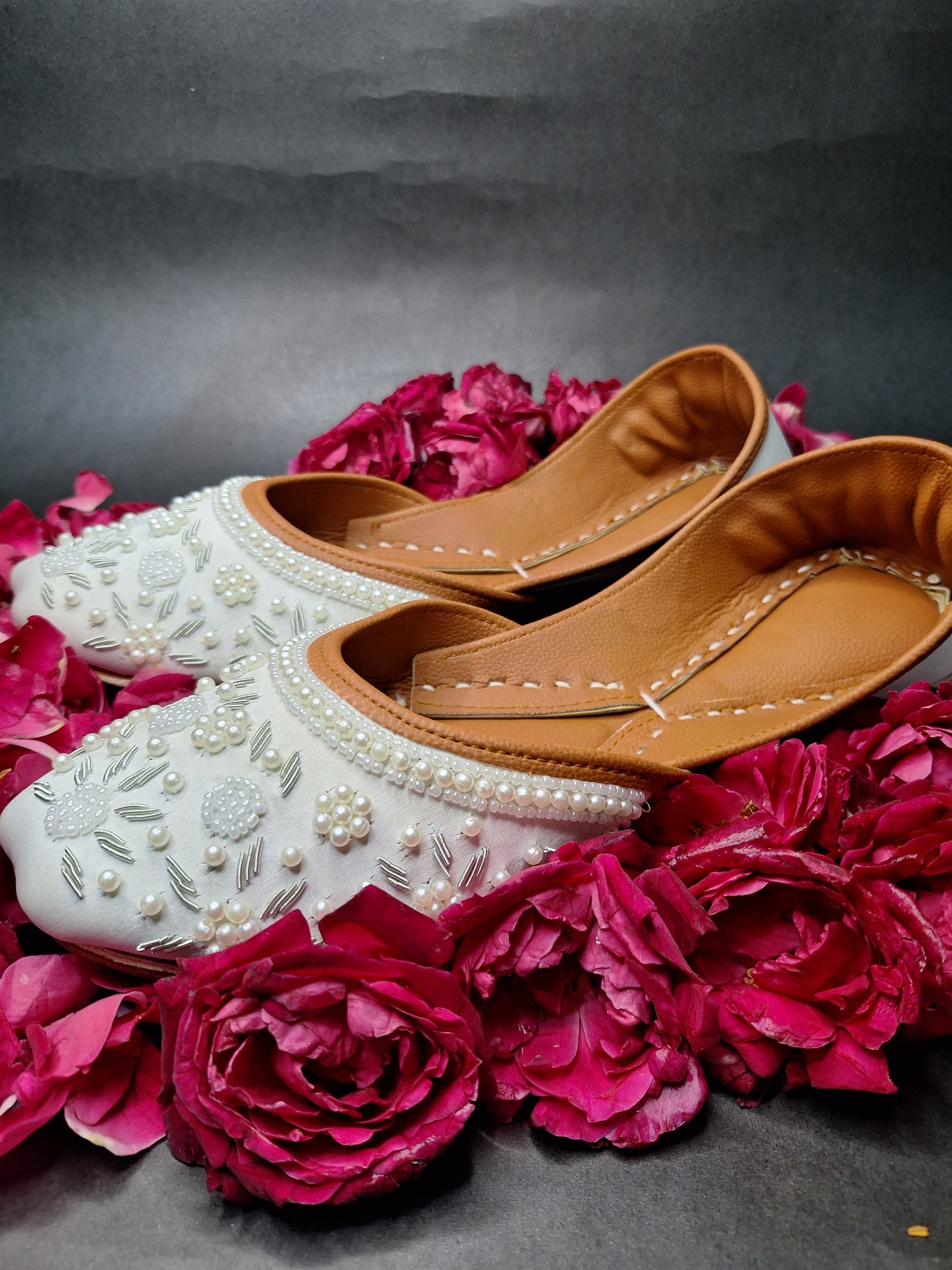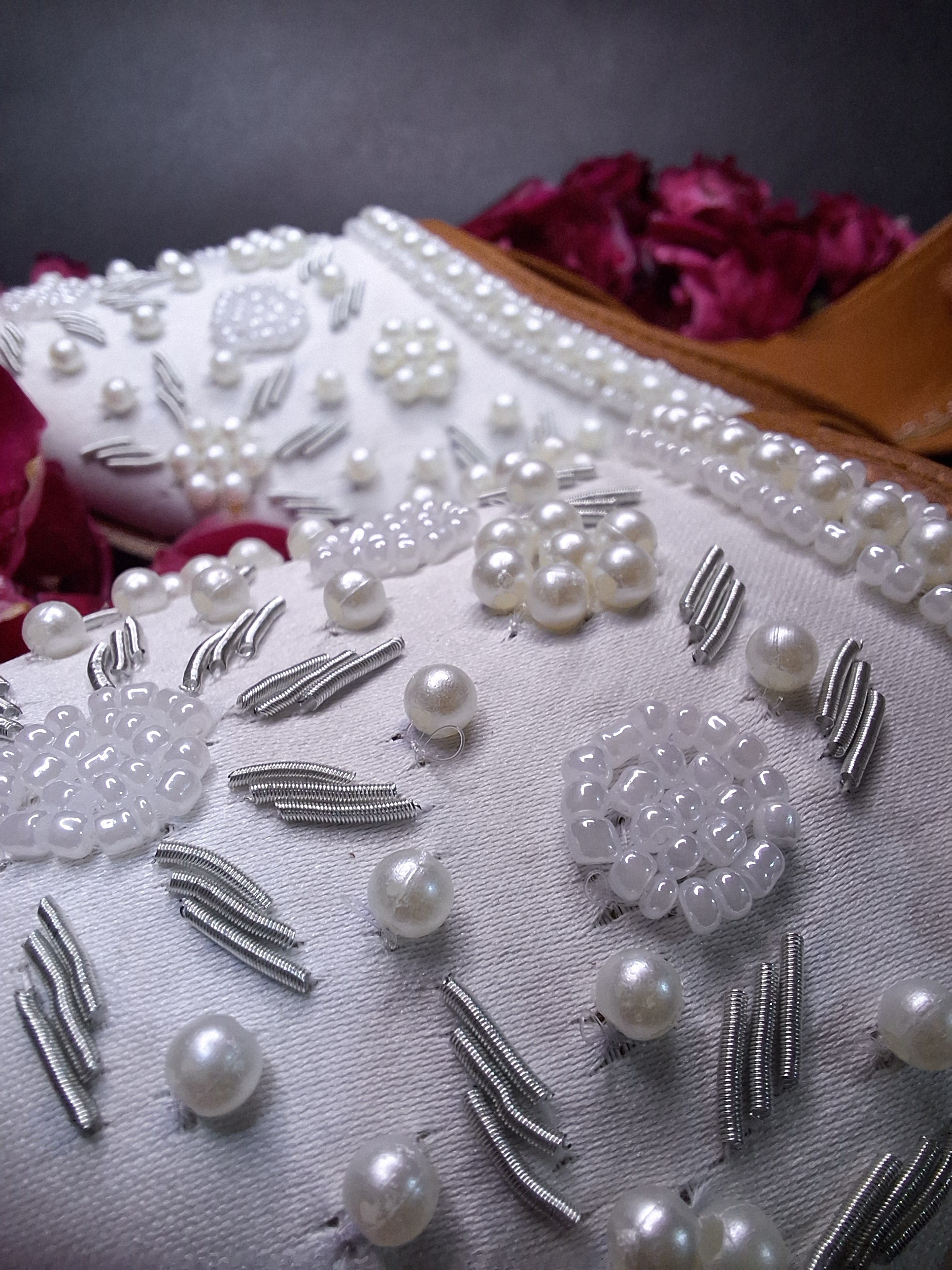 Step into timeless elegance with our Chandni Safed Casual Khussa, a versatile and comfortable pair perfect for everyday wear or casual festive outings. Crafted in pure white, this khussa is delicately embellished with white zari and white moti work, offering a subtle shimmer and understated traditional charm.