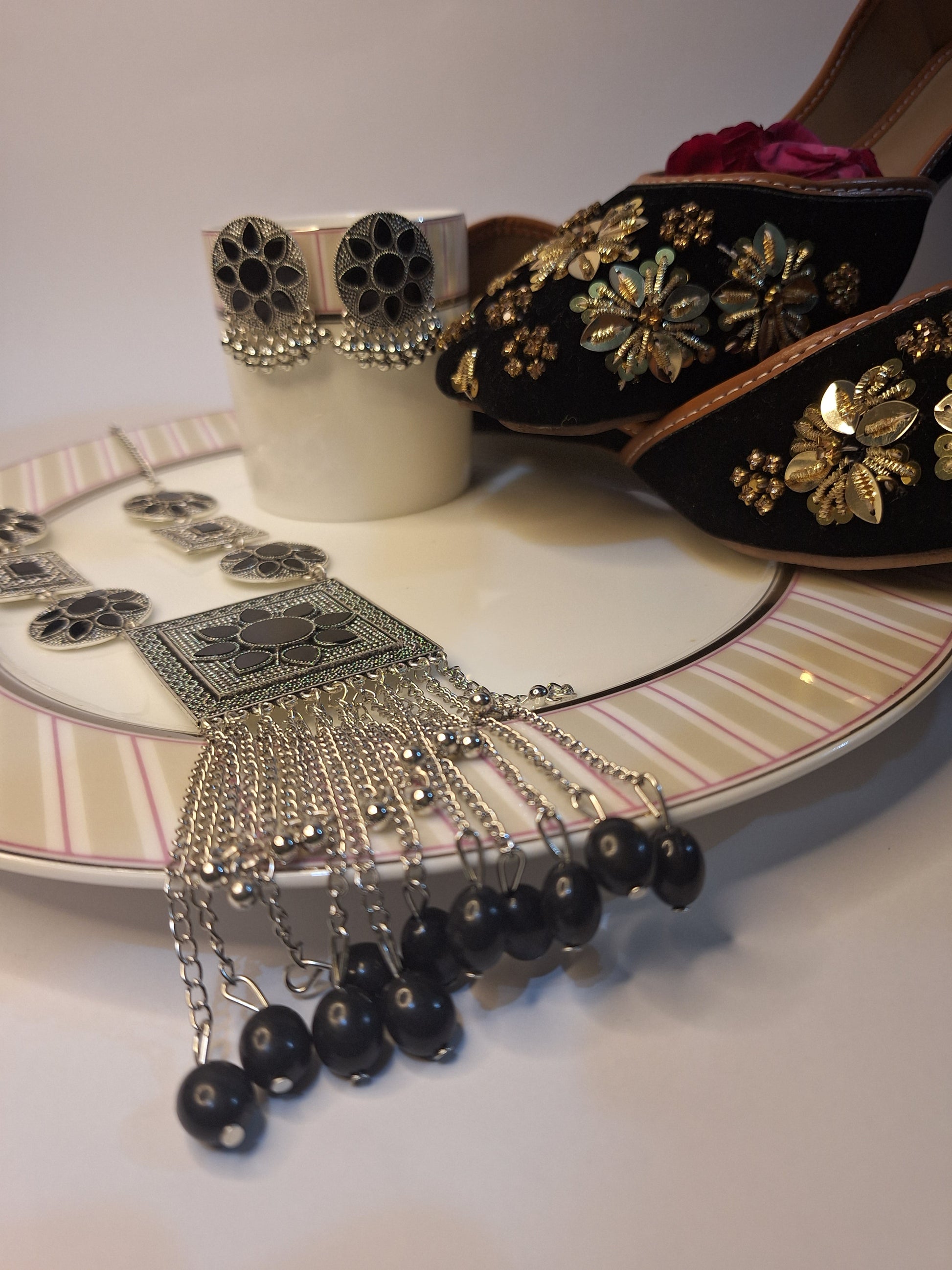 Step into elegance with the Noor-e-Zevar Black Heritage Combo, a stunning fusion of black oxidized jewelry and traditional handcrafted khussa.