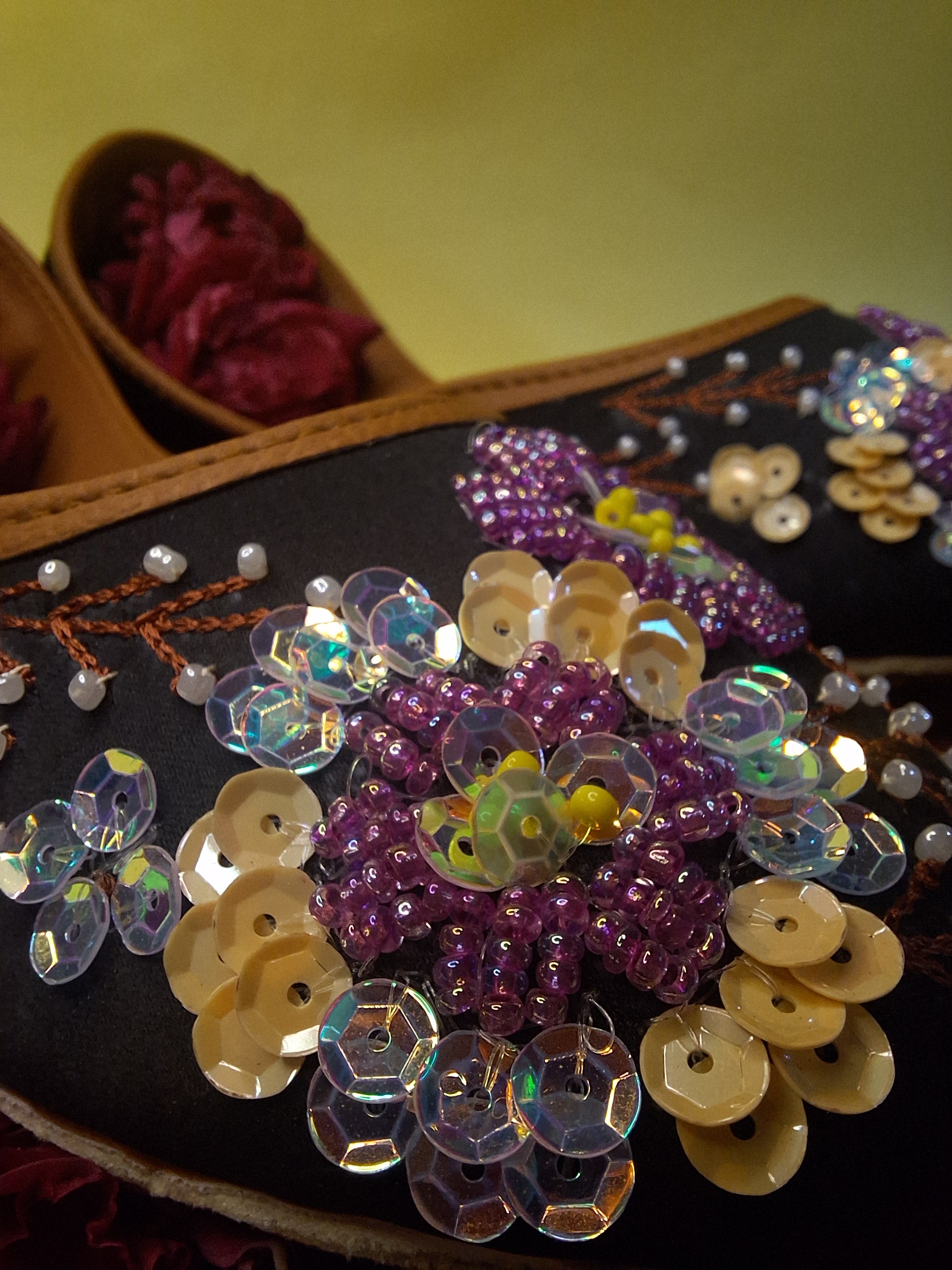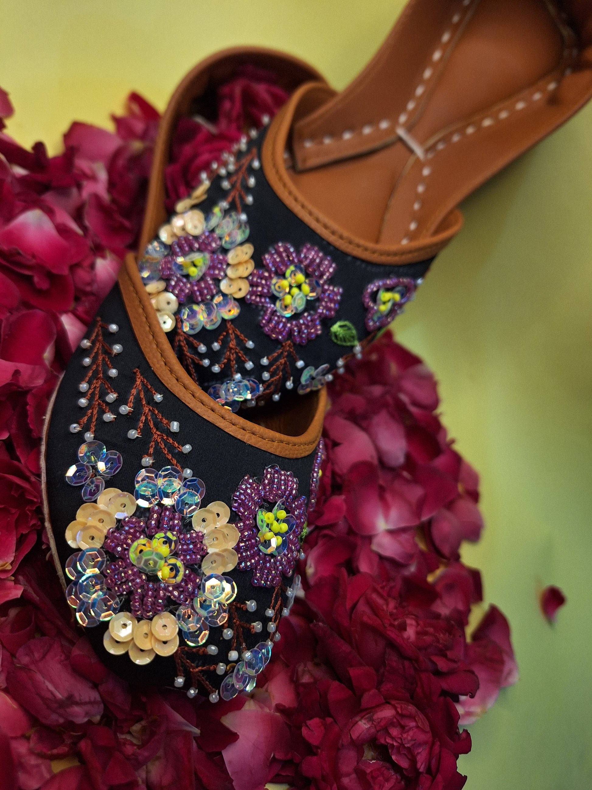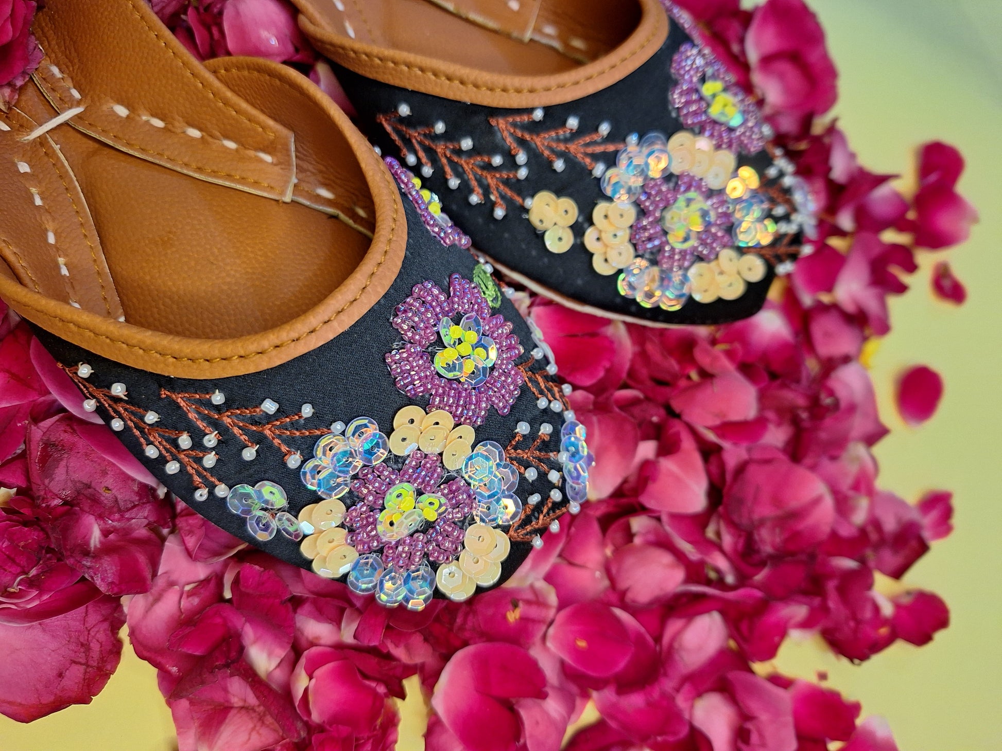 Step into vibrant tradition with our Rang-e-Shab Multi-Color Embroidered Khussa, crafted in deep pure black and adorned with rich multi-color hand embroidery. Each pair reflects traditional artistry combined with contemporary festive flair, making it a statement piece for weddings, mehndi, dholki, or festive gatherings.