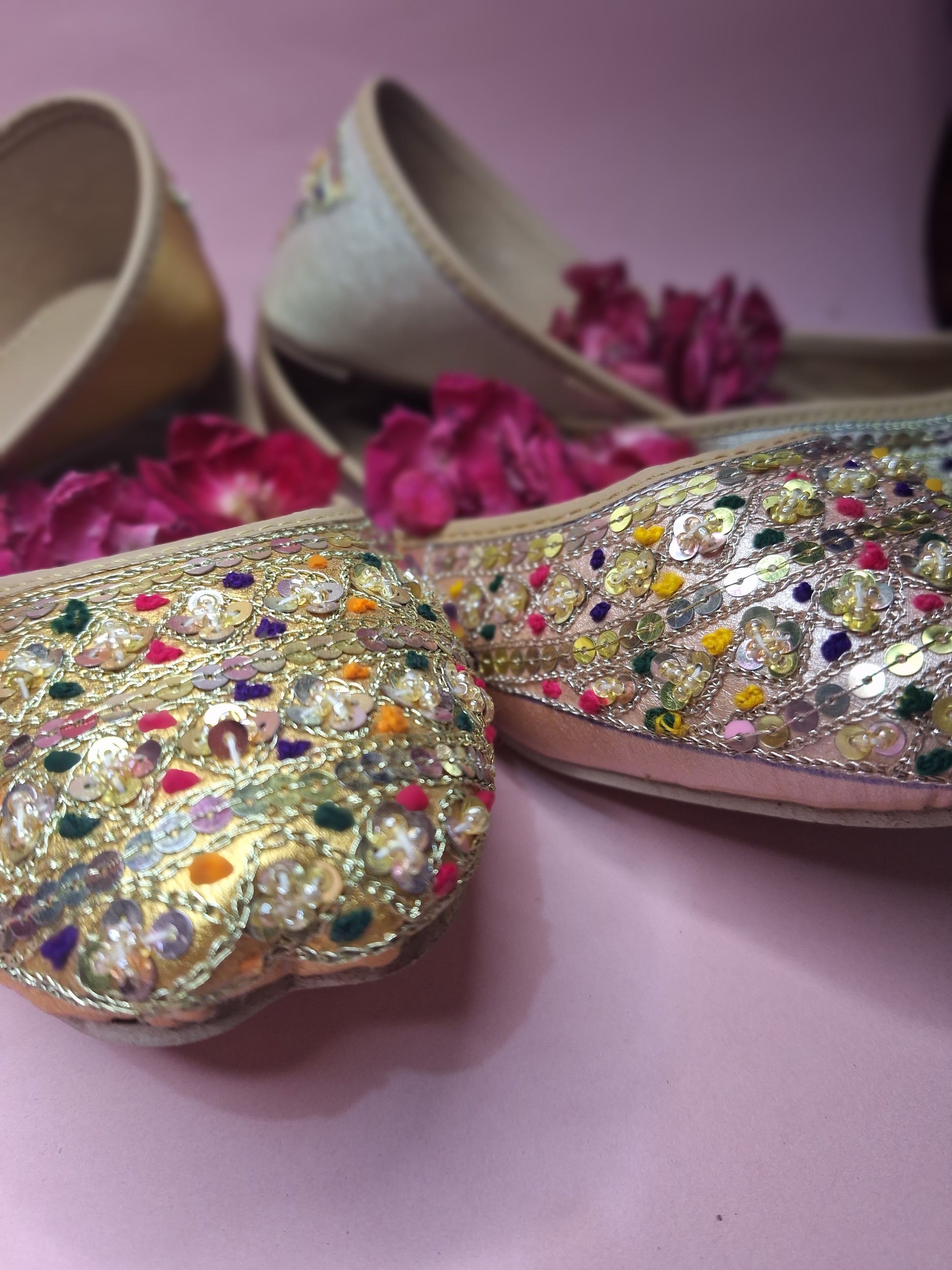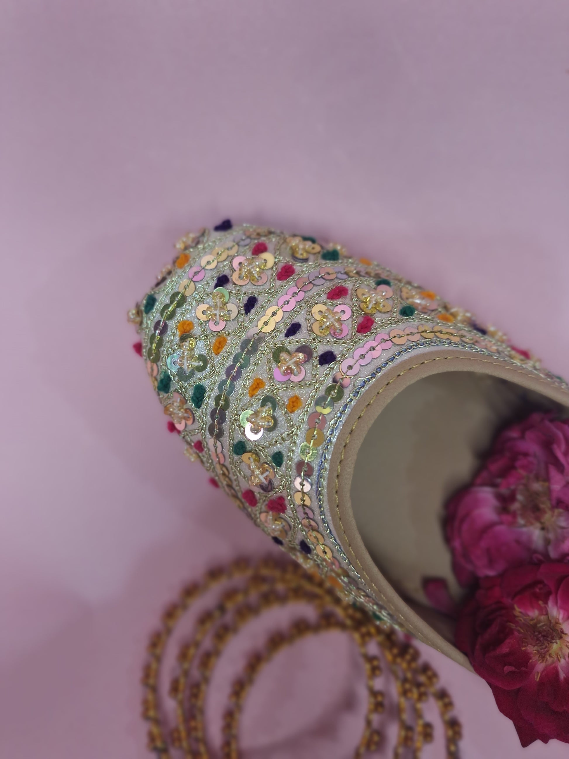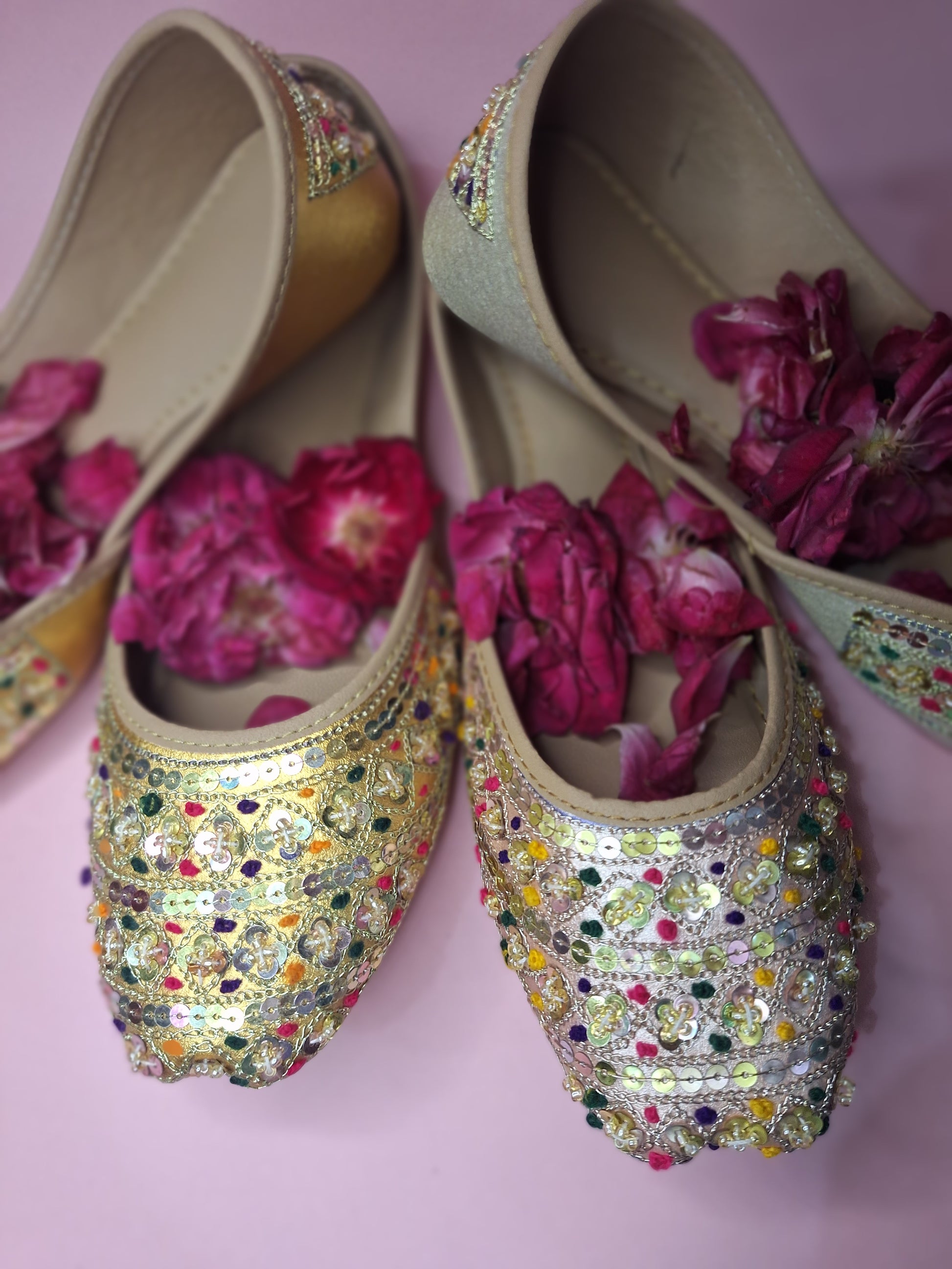 Step into festive elegance with our Rang-Mehal Khussa, a handcrafted masterpiece perfect for weddings, mehndi events, and cultural celebrations. Available in two timeless festive shades — glossy golden and shimmer silver — each pair is beautifully adorned with multi-color hand embroidery, inspired by traditional Punjabi and Mughal motifs.