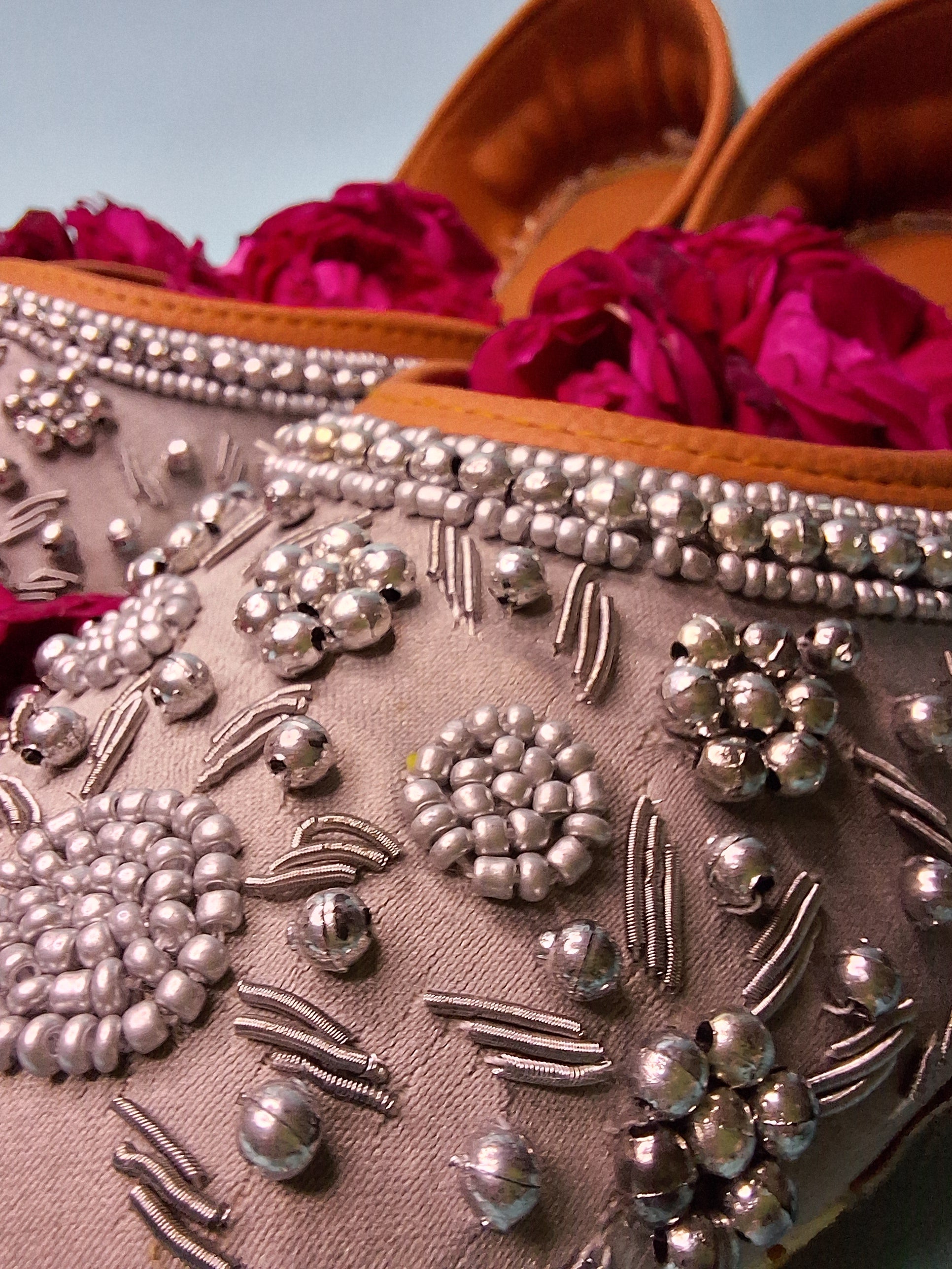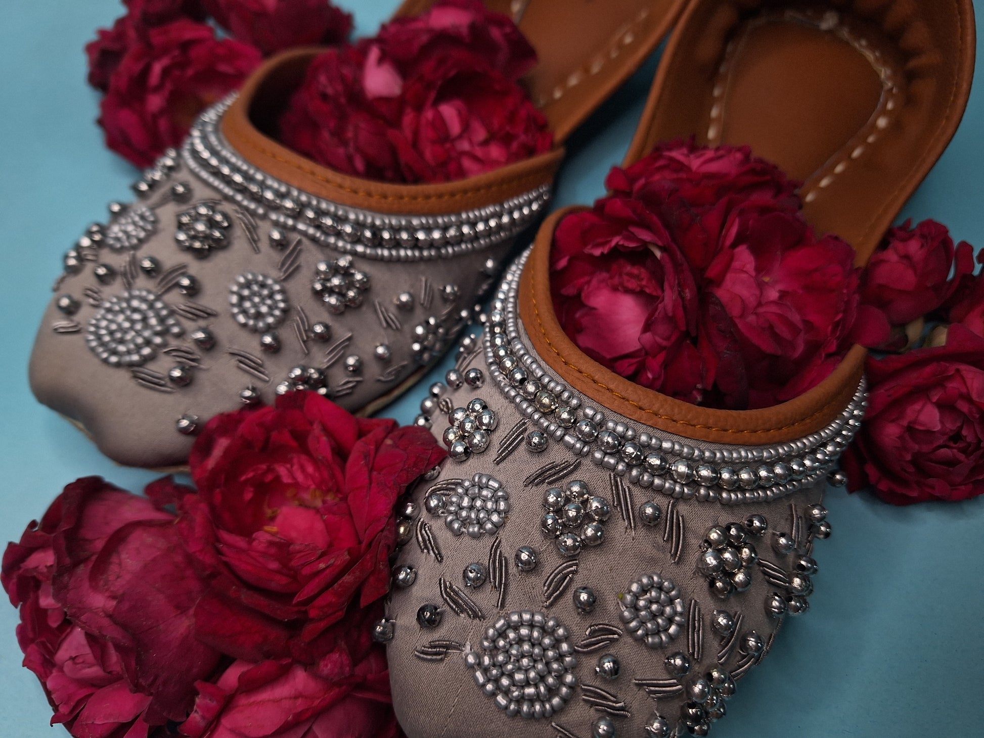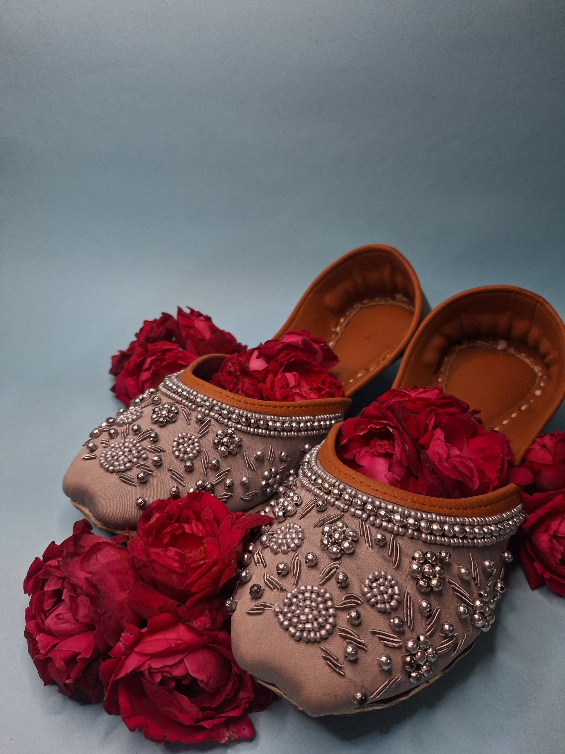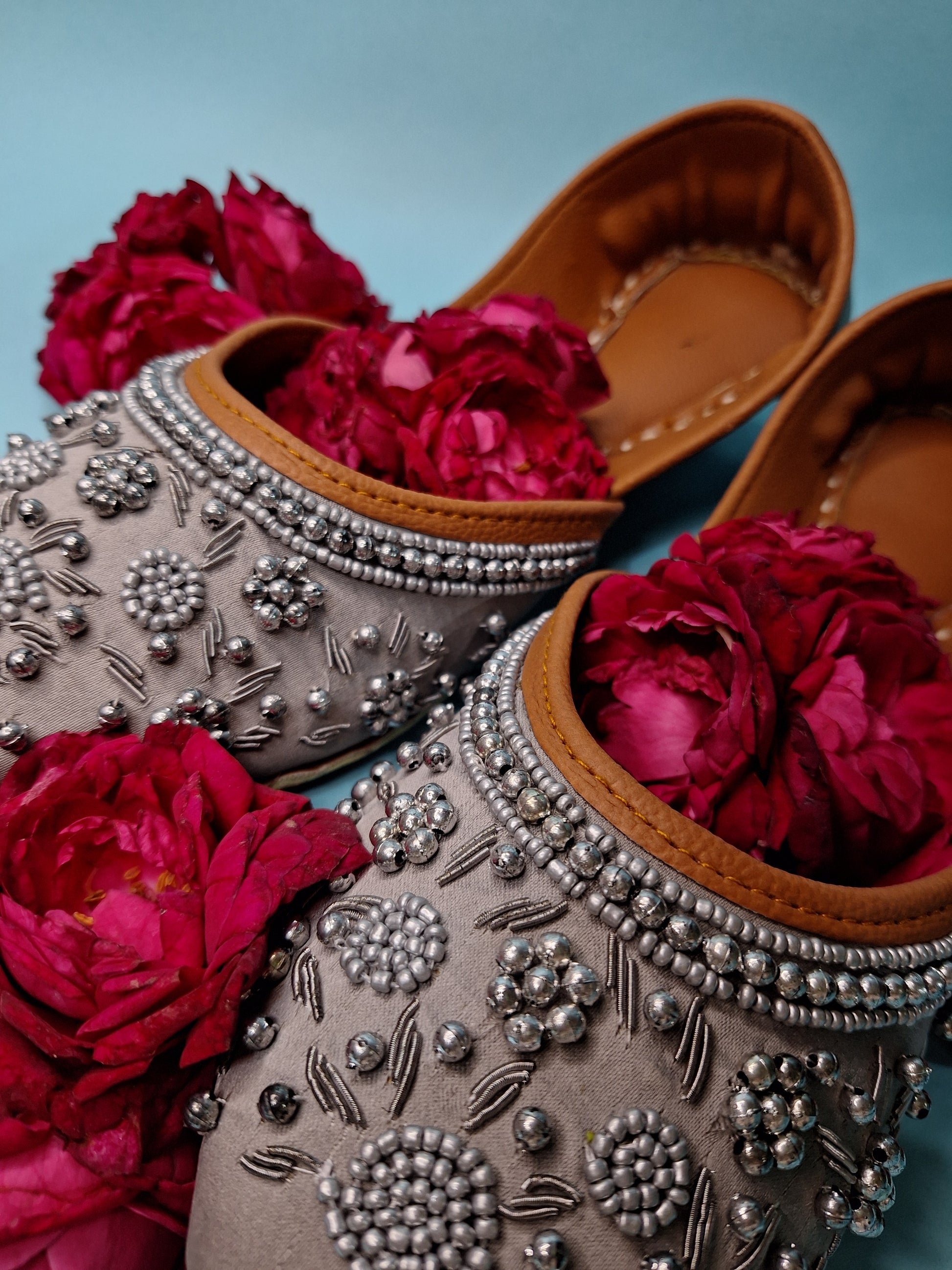 Bring subtle elegance to your everyday ethnic wear with our Sada Rang Casual Khussa. Crafted in a soft pure grey shade, this casual khussa is delicately adorned with white zari and grey moti embroidery, offering a refined, understated charm while remaining versatile and wearable.