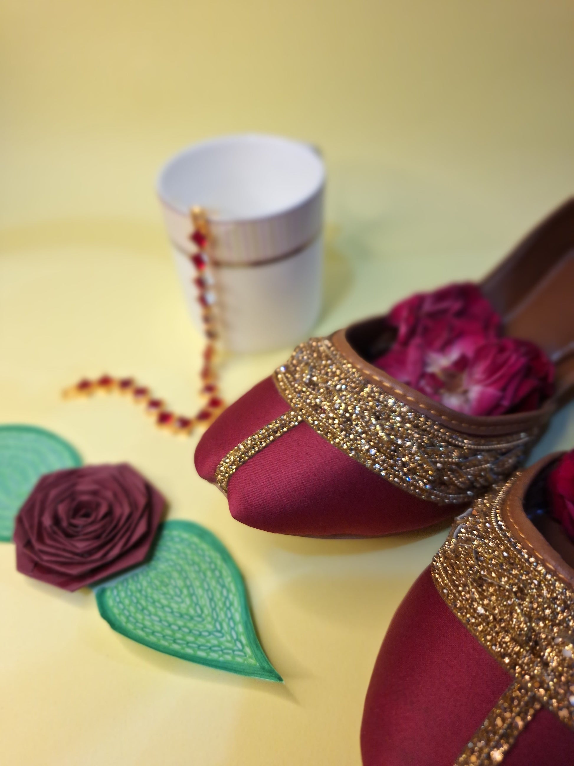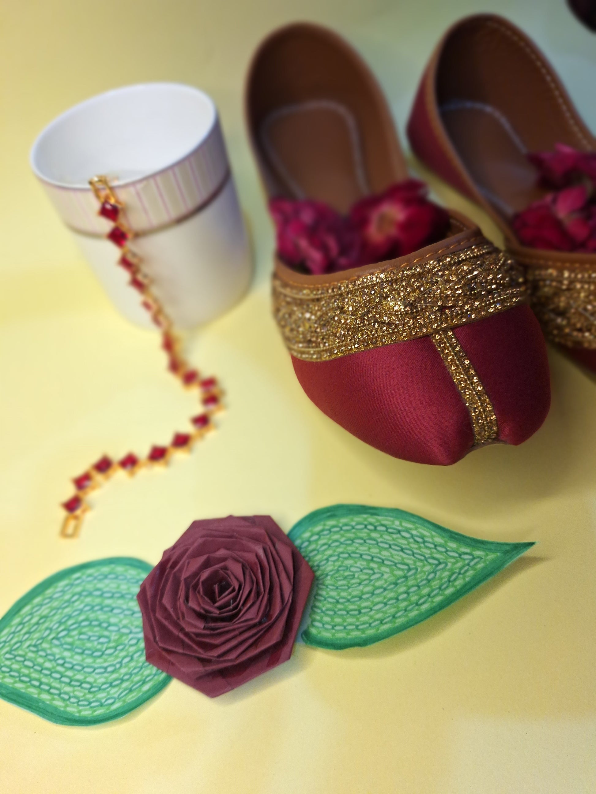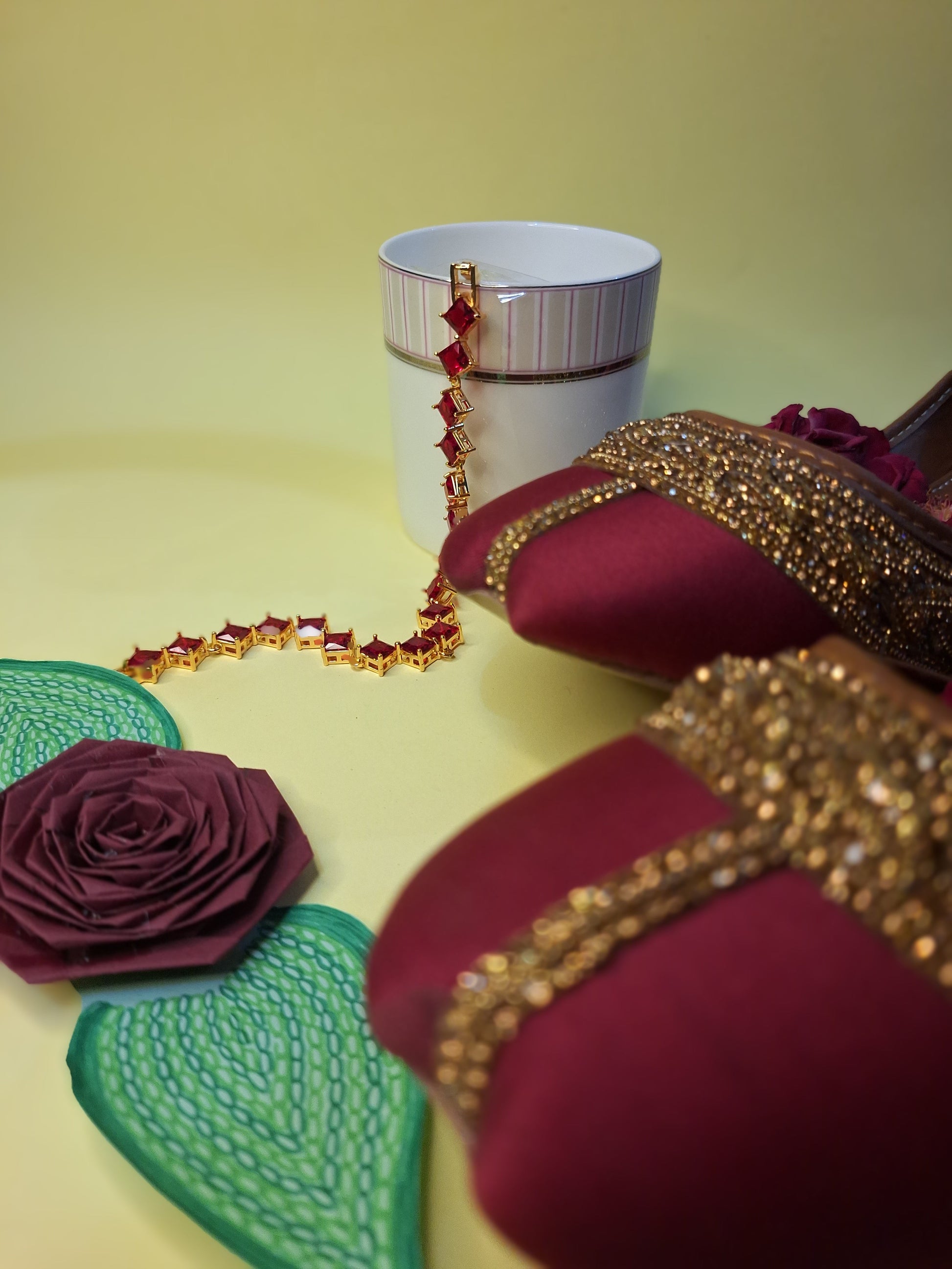 Experience regal elegance with the Zar-e-Ruby Royal Combo, a graceful pairing of hand-embroidered maroon khussa and a matching maroon bracelet accented with golden borders.